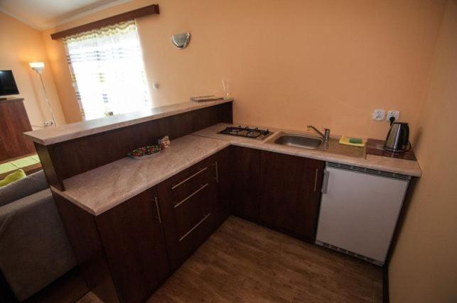 Dom z 2 sypialniami. The fireplace is a top feature of this holiday home. Boasting a private entrance, this holiday home also comes with 1 living room, 2 separate bedrooms and 1 bathroom with a walk-in shower. Guests will find a stovetop, a refrigerator, kitchenware and a tea and coffee maker in the kitchenette. The holiday home also includes a barbecue. Featuring a terrace with garden views, this holiday home also features soundproof walls and a flat-screen TV. The unit has 5 beds. Dom wakacyjny - 6 osobowy. Powierzchnia pokoju ok.: 50 mkw.