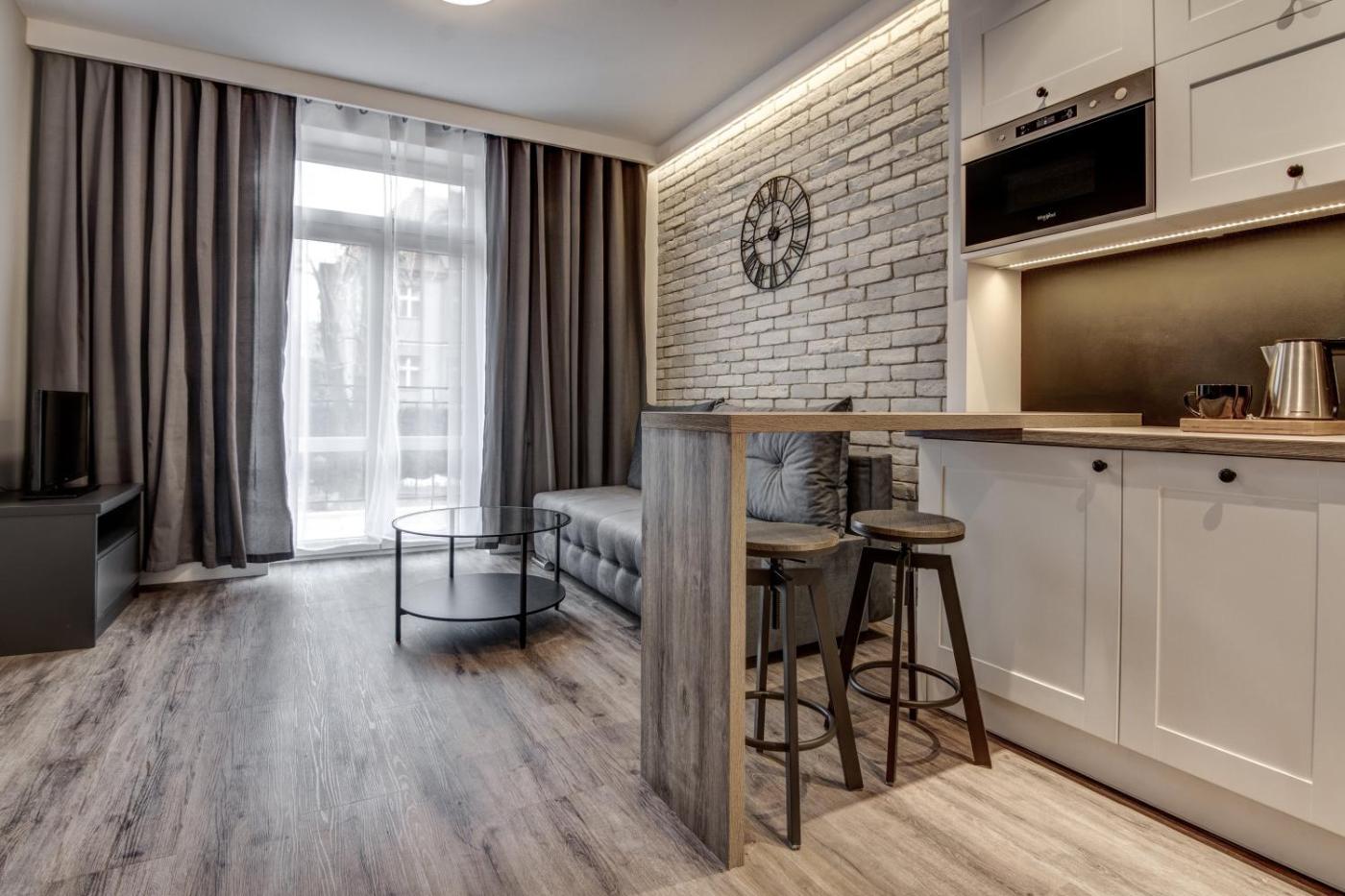 Apartament z tarasem. Ten apartament mieści sypialnię, aneks kuchenny oraz łazienkę z prysznicem i suszarką do włosów. W doskonale wyposażonym aneksie kuchennym przygotowano płytę kuchenną, przybory kuchenne, lodówkę i zmywarkę do naczyń. Apartament ten ma dźwiękoszczelne ściany. Do dyspozycji gości jest telewizor z płaskim ekranem i dostępem do kanałów satelitarnych oraz balkon z widokiem na ogród. W tej opcji zakwaterowania zapewniono 1 łóżko. Apartament - 2 osobowy. Powierzchnia pokoju ok.: 32 mkw. ;