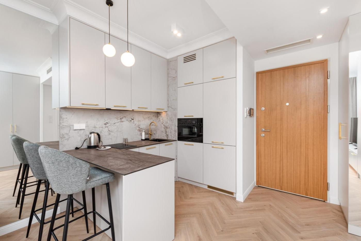 W apartamencie znajduje się salon oraz kuchnia z pełnym wyposażeniem, w tym lodówką i zmywarką.